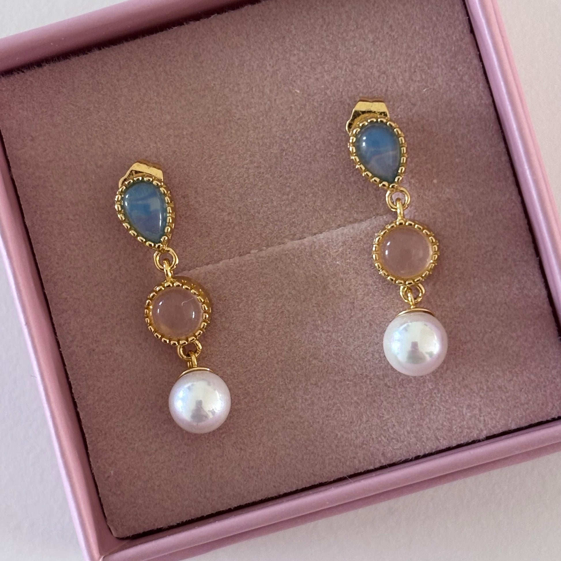 Øreringe med de sødeste pastelfarvet ægte sten og en hvid perle forenden